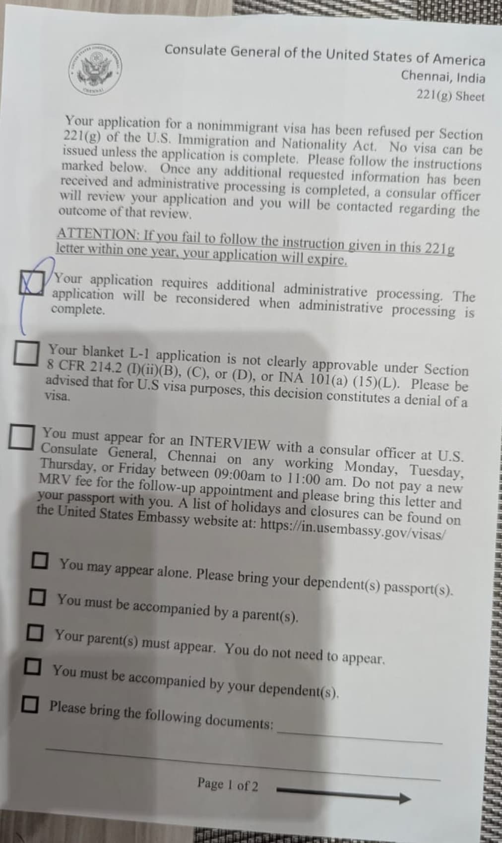 She went to Chennai Consulate for interview and she got 221G slip. They also kept the passports.